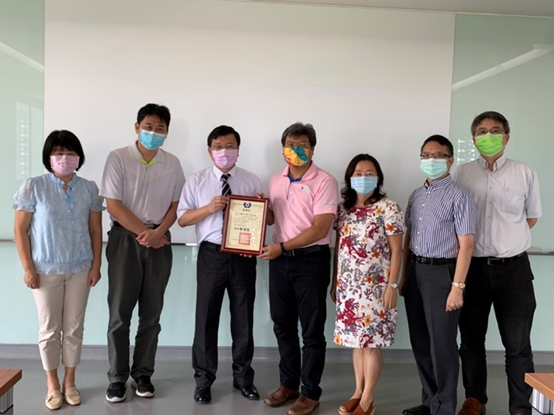 本校校長張信良(左3)與歐秋惠副執行長(左1)、王建榮副董事長(左2)、林金陽董事長(左4)、
