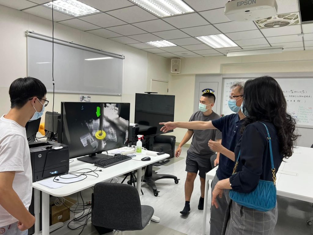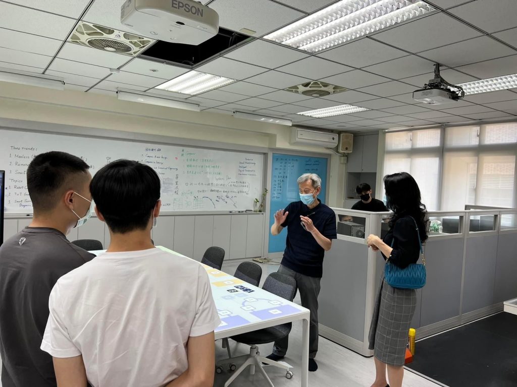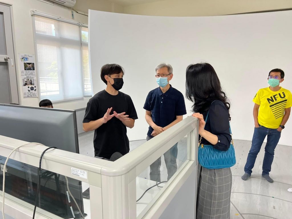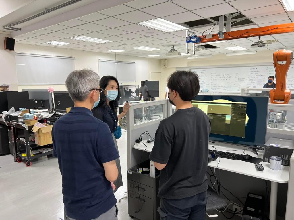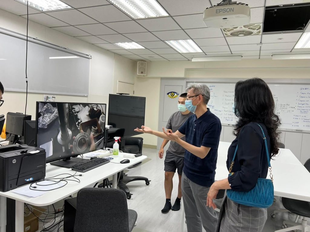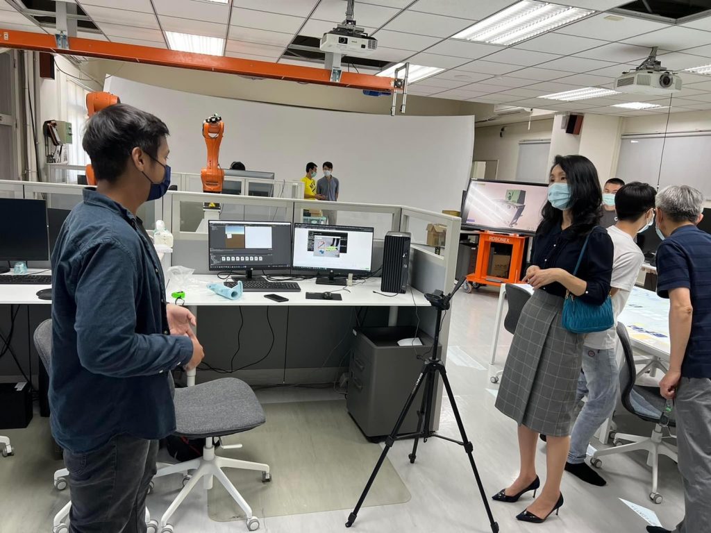 由鄭宗明老師接待黃麗玲教授並解說虛擬製造實驗室。