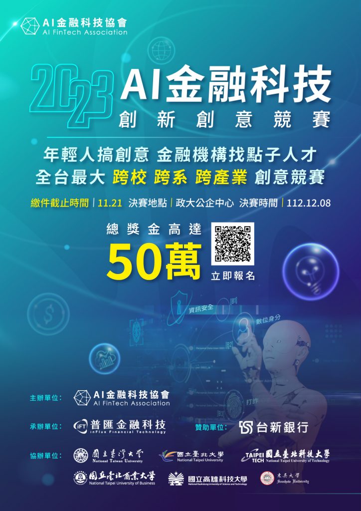 本協會將舉辦「2023 Al金融科技創新創意競賽」,競賽旨在推動AI和金融科技的結合,歷年來吸引全國各大專院校的學生及新創團隊參賽,期能培育金融科技專業人才,推動產學合作,促進金融科技產業升級。